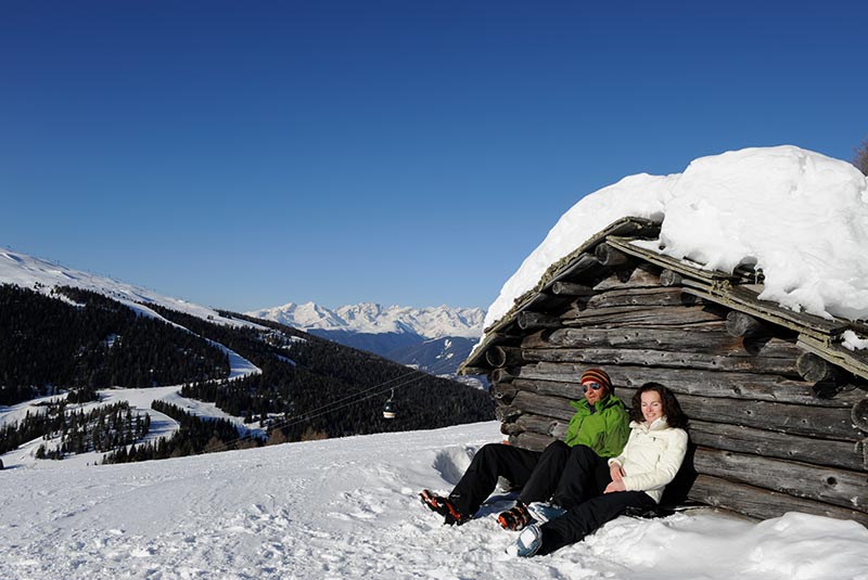 Mit der Kabinenbahn geht’s zunächst auf den Speikboden auf 2.000 m. Von dort startet die gemütliche Schneeschuhwanderung zur Trejer Alm. Wunderschöne Ausblicke inclusive!
